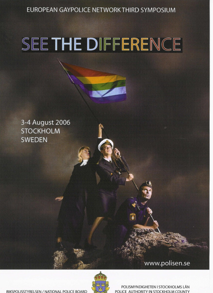 Das europäische Seminar 2006 Stockholm stellte auch das innovative Projekt „Normgiving Diversity“ vor. Das Plakat zeigte die Kooperation zwischen dem schwedischen Verein für lesbische und schwule Polizeibedienstete (Kollege vorne), dem schwedischen Militär (Dame Mitte) und der evangelischen Kirche (Dame hinten).